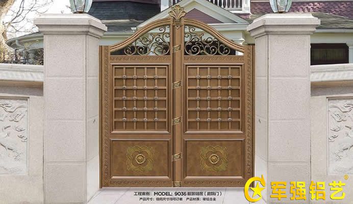 電話:0579-87967666 本款鑄鋁庭院門,型號是6870,任何尺寸均可定做,鏤空門扇采用各種尺寸鋁型材及鋁花拼接而成,實心門扇采用整體鑄鋁板而成。 軍強庭院大門產品圖片均為原創圖片,其它平臺或媒體轉載請標明圖片來源!