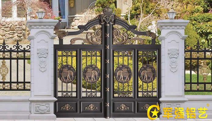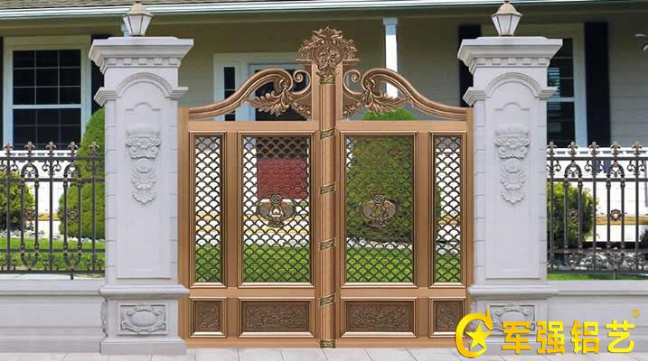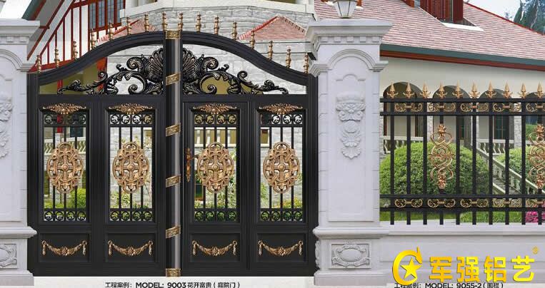 電話:0579-87967666 本款鋁藝庭院大門,型號是6868,任何尺寸均可定做,鏤空門扇采用各種尺寸鋁型材及鋁花拼接而成,實心門扇采用整體鑄鋁板而成。 軍強庭院大門產品圖片均為原創圖片,其它平臺或媒體轉載請標明圖片來源!