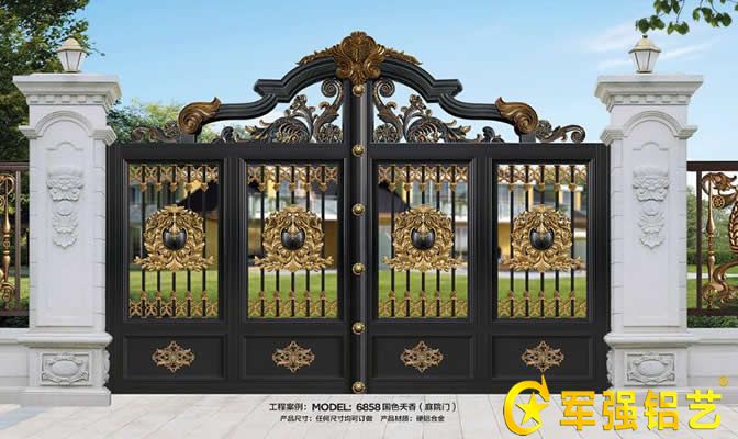 時間:2020-05-08 13:06:51 次數:277 來源:軍強庭院門本款鋁藝庭院大門,型號是6868,任何尺寸均可定做,鏤空門扇采用各種尺寸鋁型材及鋁花拼接而成,實心門扇采用整體鑄鋁板而成。